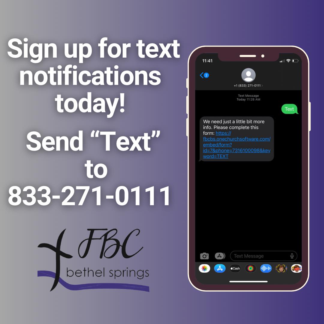 Send “Text” to 833-271-0111 to join the church wide text notification group.